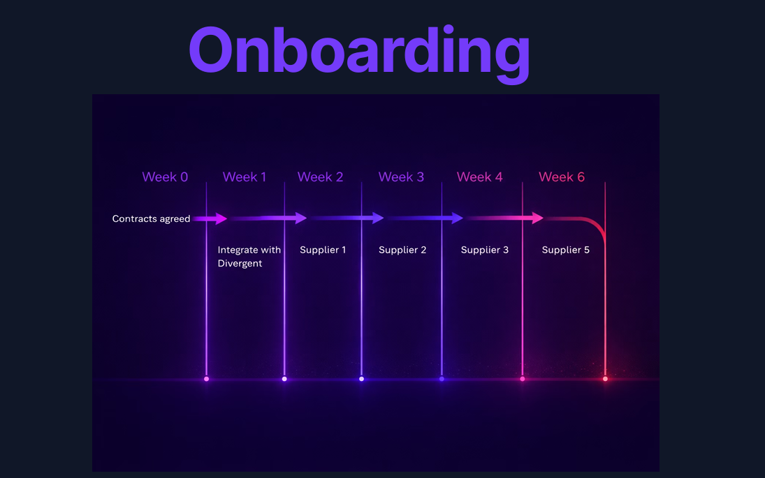Frictionless integration. Go live in 6 weeks. We know procurement teams dread long software deployments. Divergent is designed for rapid deployment, taking you from contract agreement to full supplier integration in just six weeks, complete with dedicated developer support.